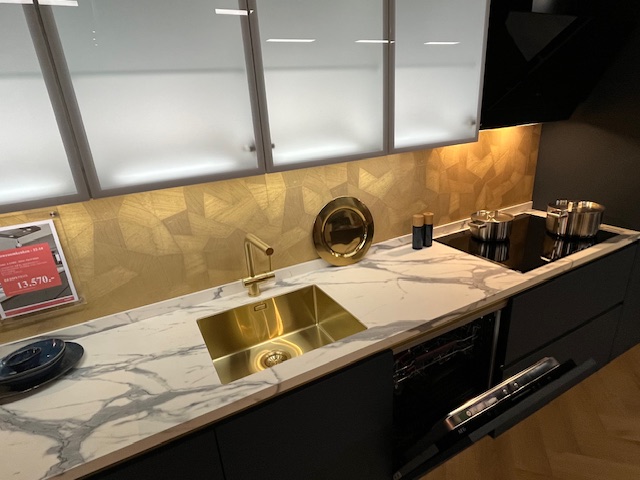 Werkblad uitgevoerd in TOPCORE - spoelbak & kraan in goudkleur.