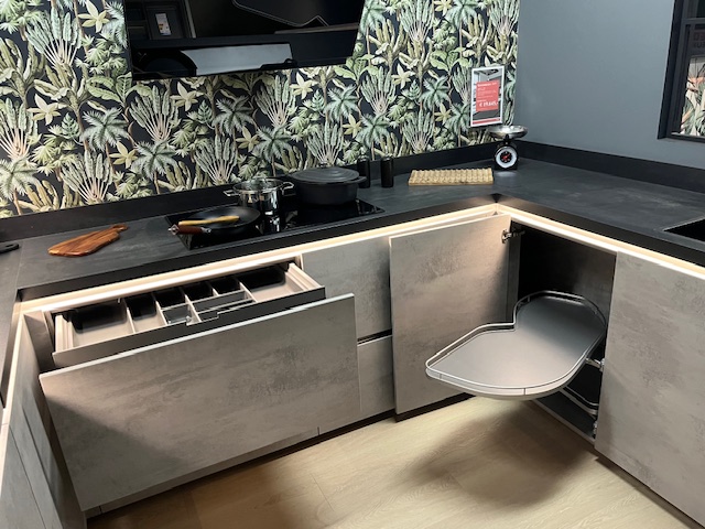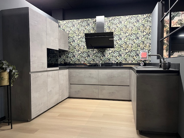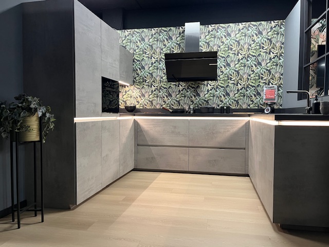 U opstelling met kunststof fronten & kasten in betonlook (binnen & buiten!) met fraaie LED verlichting in de greeplijsten.